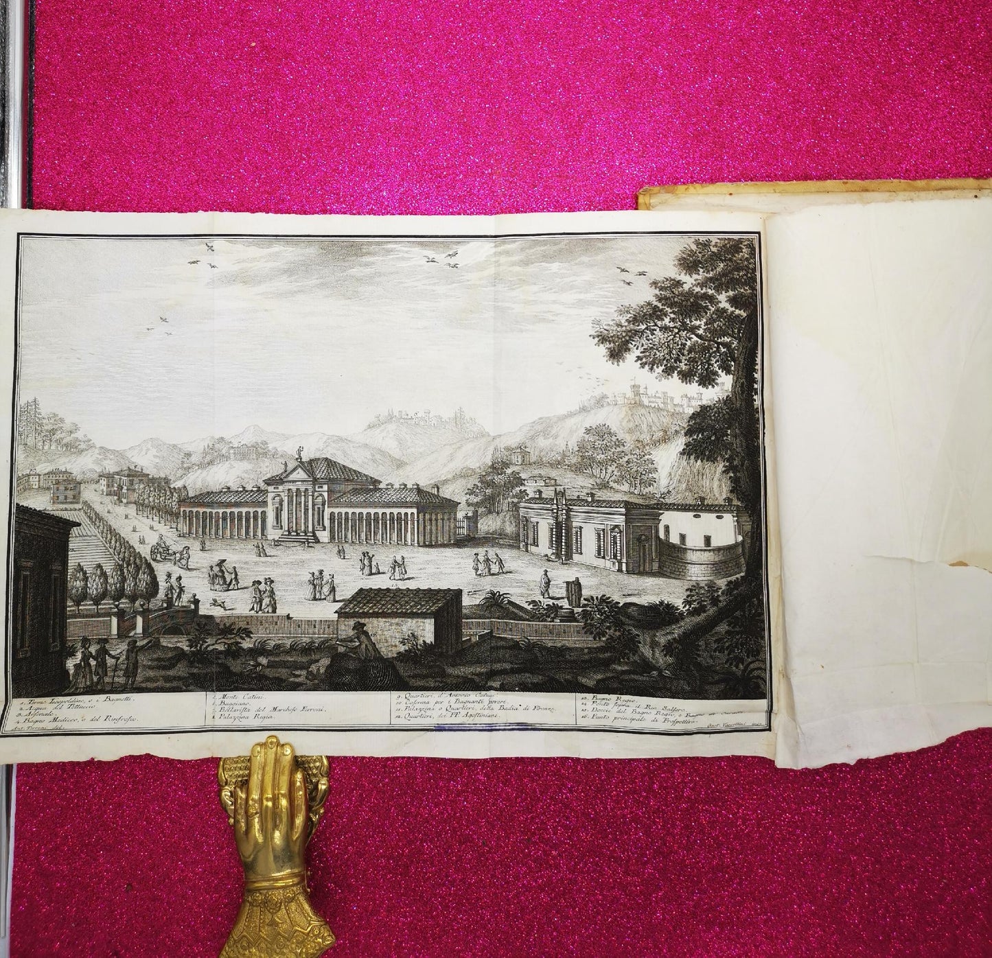 Tavola con veduta dei bagni piu volte ripiegata e pianta dei medesimi e tabella delle qualità delle acque