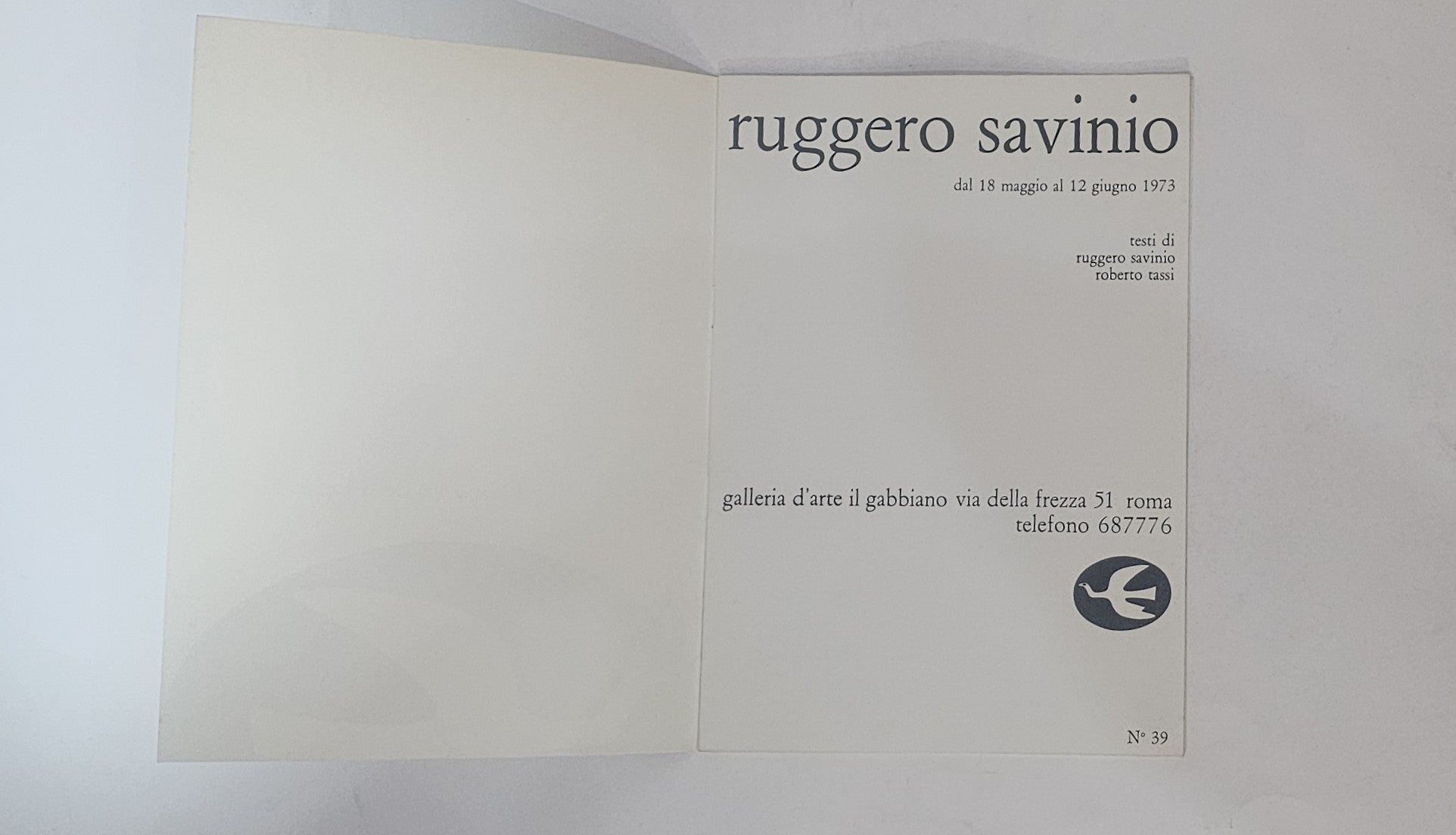 Pubblicazione promozionale realizzata in occasione di un'esposizione presso la storica galleria romana Il Gabbiano, attiva nel secondo Novecento e punto di riferimento per artisti e collezionisti.